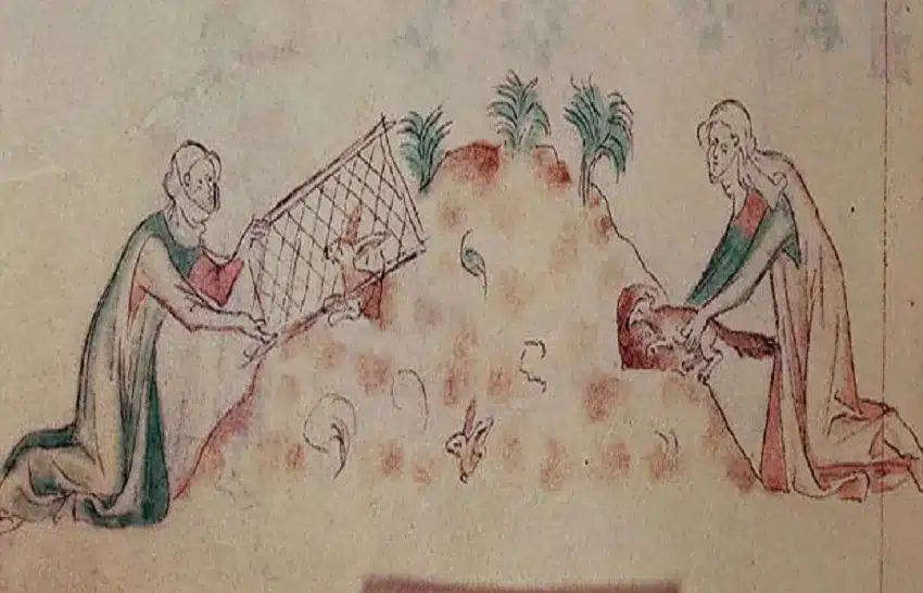 Illustration prise sur Wikipédia – Femmes chassant le lapin à l’aide de furets dressés, vers 1316-1321.